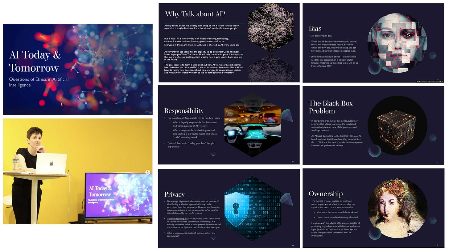 And to be clear, when I say I suddenly got hit by a flood of information, I’m not saying that I only recently started hearing about this stuff. I’ve been interested in AI ethics for a while. As evidence of this: three years ago I put together a 2 hour interactive seminar about AI that included a (high-level) explanation of how deep learning models work as well as a discussion on selected ethics topics related to AI. I presented the seminar on November 18, 2022* for an audience at the company where I was working at the time (*note that that was about two weeks before the first free version of ChatGPT was released to the public.3)